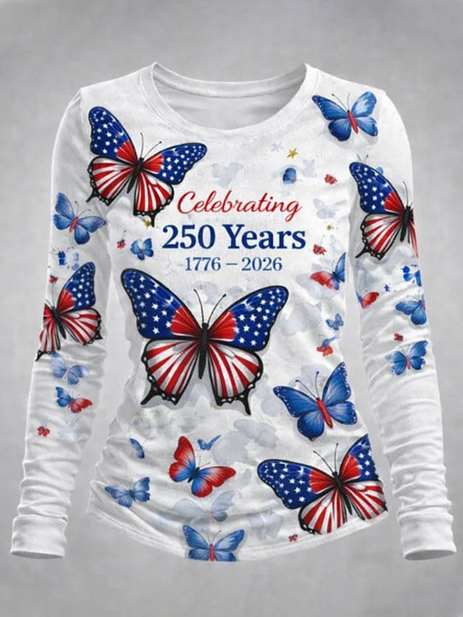 Women's US 250th Anniversary 1776-2026 Butterfly Flag Long-Sleeve Tee – Patriotic Watercolor Butterfly Print Casual Top