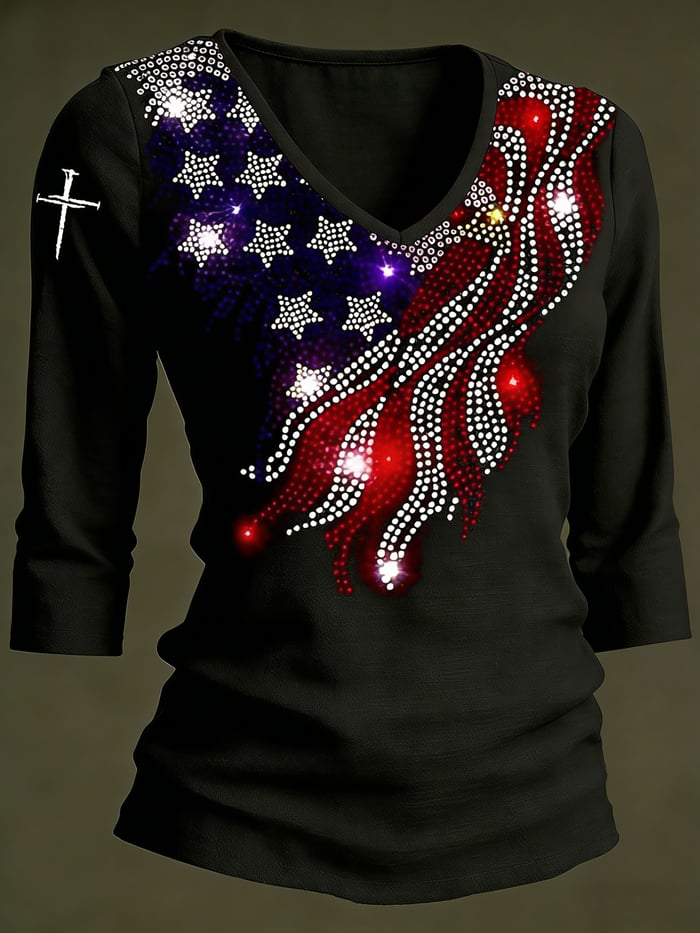 Women's US 250th Anniversary Faith & Sparkle Flag V-Neck Top – Rhinestone American Flag-Inspired 3/4 Sleeve Tee